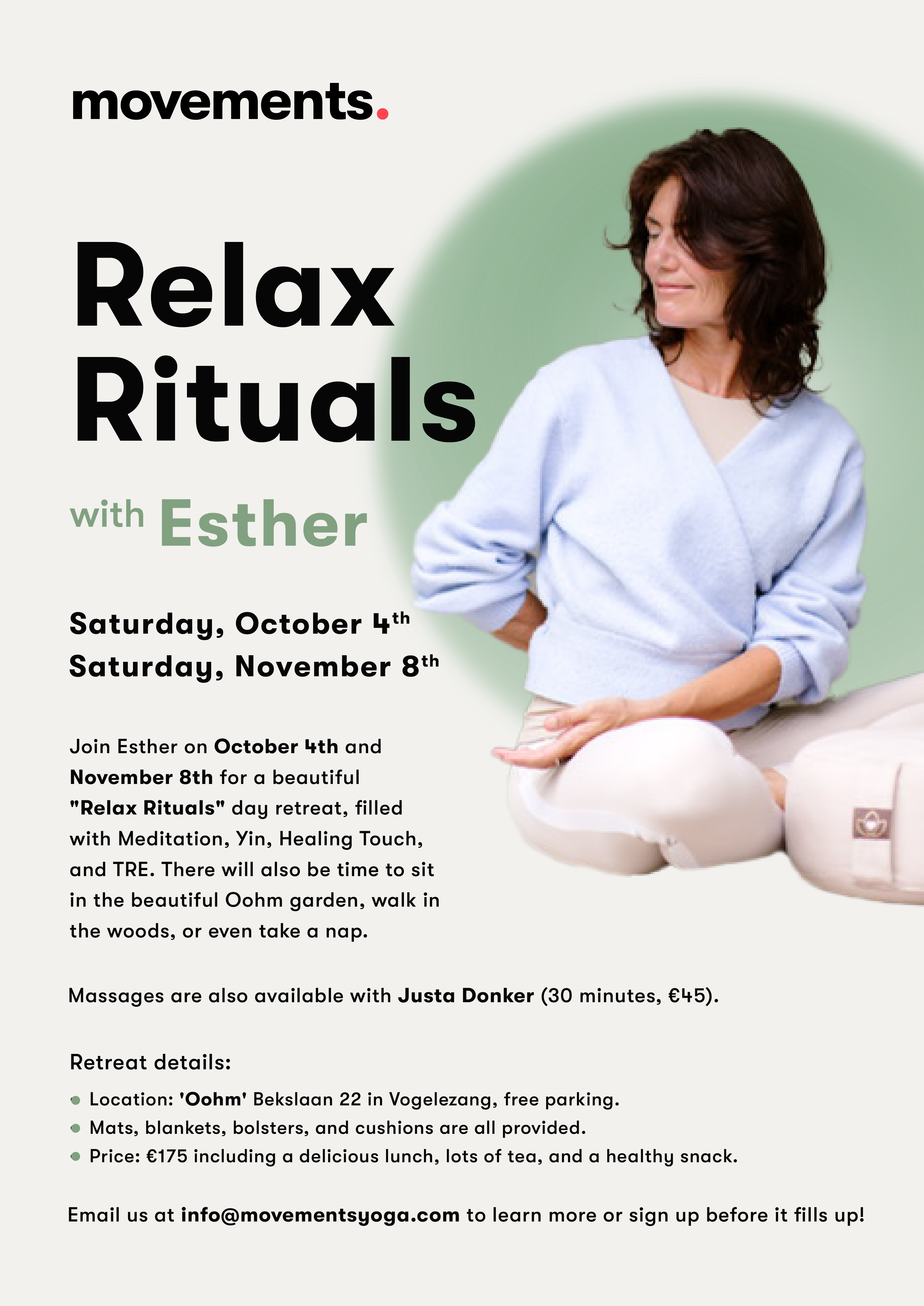 Join Esther on Saturday, October 4 or November 8, for a beautiful “Relax Rituals Day Retreat”, filled with Meditation, Yin, Healing Touch, and TRE. There will also be time to sit in the beautiful Oohm garden, walk in the woods, or even take a nap. Massages are also available with Justa Donker (30 minutes, €45).